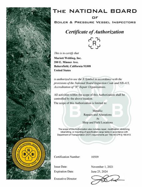 Mariott Welding May PERFORM the REPAIR AND ALTERATION OF Metallic PRESSURE RETAINING ITEMS IN ACCORDANCE WITH ASME Section VIII Div.1 PRESSURE VESSELS, ASME Section I Power Boilers, ASME Section IV Heating Boilers, AND ASME B31.1 Power Piping.